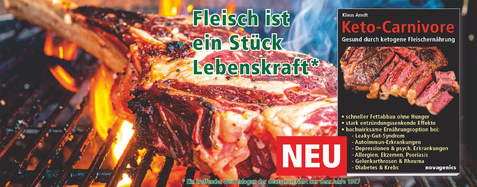 Im Buch „Keto-Carnivore – gesund durch ketogene Fleischernährung“ wird dargelegt, dass Fleisch und tierisches Fett eine hocheffektive Ernährungsoption bei vielen schwer behandelbaren und chronischen Krankheiten sein können. Mit der Carnivore-Diät (bei Verzicht auf alle pflanzlichen Produkte) ist es gelungen, das Leaky-Gut-Syndrom in den Griff zu bekommen. So kann der Körper seine ungeschwächte Immunabwehr wieder einsetzen, was zu überraschenden Heilerfolgen führt bei Autoimmunkrankheiten, Morbus Crohn, Diabetes, Ekzemen, Schuppenflechte und Allergien. Selbst bei Krebserkrankungen sind jahrelange Stabilisierungen der Krankheit nachgewiesen.
